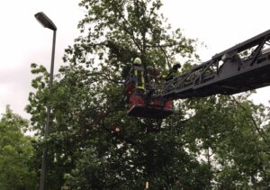 Ein Baum wurde entwurzelt und lehnte an einem weiteren Baum. Der entwurzelte Stamm wurde zunächst mit dem LF 16-TS und einem Drahtseil aus dem anderen Baum heraus gezogen, anschließend dann mit der Kettensäge zersägt und zur Seite gelegt. Im weiteren Verlauf wurde eine Drehleiter nachgefordert, um noch in der Krone hängende Äste heraus zu ziehen und abzulegen.