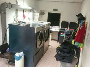 Nicht nur die Reinigung selbst, sondern auch die Logistik ist mit einigem Aufwand verbunden. Daher wurde ein bestimmter Ablauf festgelegt. Ein Mitglied der Löscheinheit bringt dazu die zu reinigenden Ausrüstungsgegenstände mit einem Dienstfahrzeug zu einer der drei Feuerwachen. Die Kollegen der Berufsfeuerwehr kümmern sich dann in den Abendstunden um die Wäsche, da diese aufwändig und zeitintensiv ist. Am nächsten Tag können die Sachen dann durch uns wieder abgeholt werden.