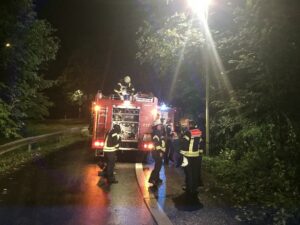 Gegen 23:35 Uhr wurde die Löscheinheit Querenburg zu einem umgestürzten Baum auf der Abfahrt der Universitätsstraße zur Schattbachstraße alarmiert. Die Drehleiter der Hauptfeuer- und Rettungswache 3 war bereits vor Ort und benötigte Unterstützung.