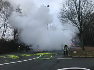 Gegen 15 Uhr wurde die Löscheineit Querenburg zu einem LKW-Brand alarmiert. Bereits auf der Anfahrt war eine dunkle Rauchsäule zu erkennen. Die Zugmaschine und Teile des Anhängers waren in Brand geraten. Zusammen mit der Berufsfeuerwehr wurde der Brand mit mehreren Strahlrohren unter PA (Pressluftatmer) gelöscht. Zudem musste eine Wasserversorgung über eine lange Wegstrecke aufgebaut werden.