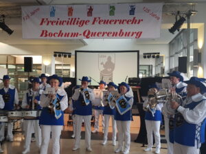 Am 22.06.19 fand der Festakt zur 125-jährigen Jubiläum der Löscheinheit Querenburg statt. Mit Unterstützung des Akademischen Förderungswerks der Ruhruniversität Bochum feierten ca. 120 Gäste im Bistro der Mensa. Mit Grußworten der Bürgermeisterin Gaby Schäfer, des Amtsleiters der Feuerwehr Bochum Simon Heussen, des Sprechers der Freiwilligen Feuerwehr Bochum Karl Appelhoff und des Löscheinheitsführers Bernard Schwarze begann das bunte Programm an diesem Abend. Verdiente Kameraden der Löscheinheit wurden geehrt und befördert. Weiter begleitet wurde der Abend durch den Musikkorps Blau Weiß Bochum, die Band „Averest“ und das Comedyduo „die Becker und Frau Sierp“. Bilder und Videos der Vergangenheit, welche bis in die 50er Jahre zurückreichten, sorgten ebenfalls für eine gute und ausgelassene Feierstimmung unter den Gästen. Abgerundet wurde die Feier durch die kulinarische Unterstützung seitens des Akafö. Mit dabei war auch eine Abordnung der Partnerfeuerwehr Dobrna aus Slowenien. Die beiden Feuerwehren verbindet seit über 10 Jahren eine tiefe Freundschaft.