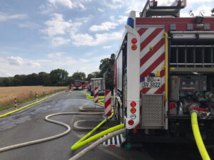 Anschließend löste das LF20 KatS ein Fahrzeug der Berufsfeuerwehr ab, welches mehrere Strahlrohre und eine Drehleiter bespeißte.