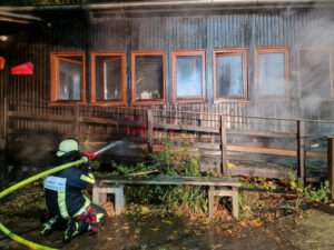 Nach kurzer Verweilung am Gerätehaus wurden wir zur Einsatzstelle alarmiert. Als wir vor Ort eintrafen, standen große Teile des Gebäudes im Bereich der Fassade, des Satteldaches sowie des aufgeständerten Bodens in Flammen. Wir unterstützten mit mehreren Trupps unter schwerem Atemschutz bei den Löschmaßnahmen sowie den anschließenden Nachlöscharbeiten und öffneten dabei die Decken- und Bodenverkleidungen, um Glutnester abzulöschen.