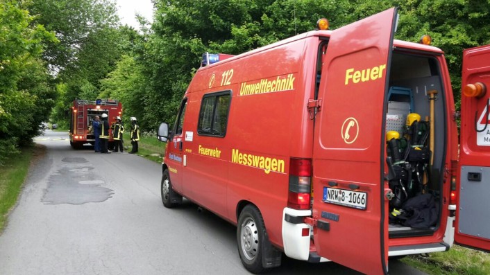 Zunächst wurde angenommen, dass während eines Brandes eine unbekannte Flüssigkeit aus einem Behälter austritt. Diese Flüssigkeit verflüchtigte sich und zog in Windrichtung ab. Der unbekannte farbige gasförmige Stoff wurde durch den Angriffstrupp mit einem Sprühstrahl niedergeschlagen. Gleichzeitig ging ein CSA-Trupp des ABC-Erkunder für eine Probenentnahme vor.