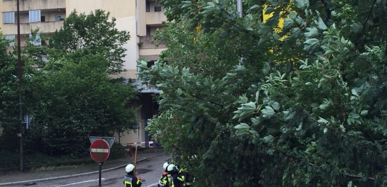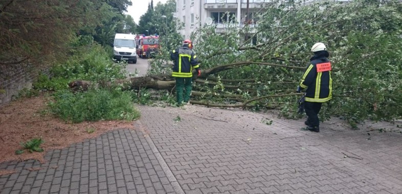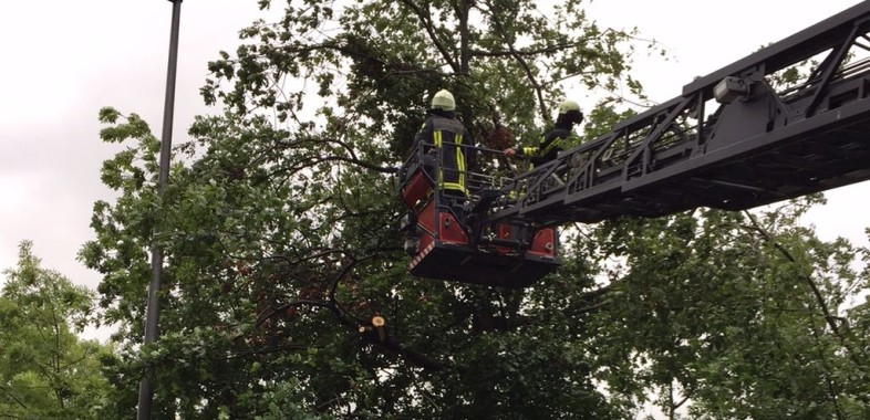 Ein Baum wurde entwurzelt und lehnte an einem weiteren Baum. Der entwurzelte Stamm wurde zunächst mit dem LF 16-TS und einem Drahtseil aus dem anderen Baum heraus gezogen, anschließend...[49/15] – 25.07.2015, TH 0 Baum auf Straße, Wittkampstr.