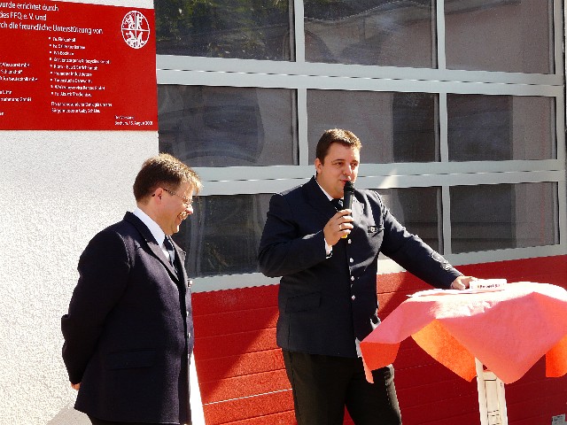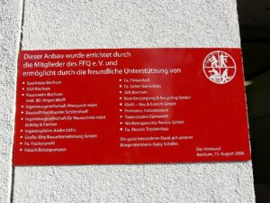 Am 15. August 2008 war es soweit. Der Anbau an das Gerätehaus der Freiwilligen Feuerwehr Bochum Querenburg, welcher nach einjähriger Planungs- und achtmonatiger Bauzeit nahezu fertig gestellt war, konnte im Rahmen des Brandschutztages des FFQ e.V. feierlich übergeben werden. In einer Feierstunde, zu der bei herrlichem Sommerwetter viele geladene Gäste und Freunde der Löscheinheit kamen, wurde in einigen kurzen Ansprachen die herausragende Leistung hervorgehoben, die zur Vollendung des Bauwerkes nötig war. In Form eines symbolischen Schlüssels wurde das Gebäude durch den Vorsitzenden des FFQ e.V., Bernard Schwarze an die Stadt Bochum, vertreten durch Bürgermeisterin Gabriele Schäfer übergeben. Diese reichte den Schlüssel mit den besten Wünschen sofort an den Löscheinheitsführer Jürgen Schild weiter.