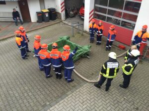 Heute haben wir bei dem Übungsdienst ein Provisorisches Auffangbecken aufgebaut. Bevor das Becken aufgebaut werden konnte wurde besprochen was benötigt wird und wozu wir ein Auffangbecken benötigen, wie zum Beispiel Dekontamination der Einsatzkräfte oder Materialien. Nachdem der Theoretische Teil abgeschlossen war hieß es für die Jugendlichen in Teamarbeiten das Becken aufzubauen. Dabei werden die Leitern verkeilt, dass ein Becken enstehen konnte, danach wurde ein Plane reingelegt und mit Spanngurten befestigt. Somit stand das Becken und konnte befüllt werden. Zum Abschluss wurde das Prinzip vom Wassersaugern erklärt und auch die praktische Anwendung wurde gezeigt. Am Ende wurde alles wieder auf die Fahrzeuge verlastet. Der Übungsdienst konnte im Anschluss für beendet erklärt werden.