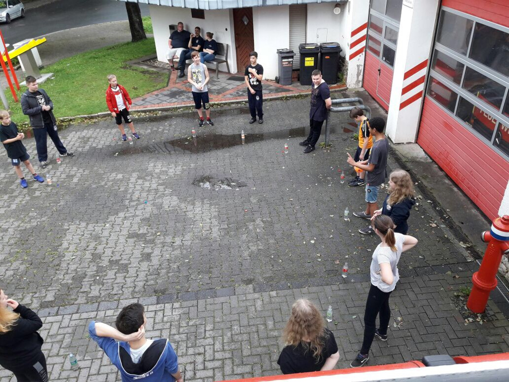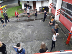 - Einen Wassereimer auf Zeit befüllen und anschließend mit Wasser befüllten Bechern durch einen Parcours aus Pylonen und einer Leiter laufen. Es spielten jeweils 2 Gruppen gegeneinander
