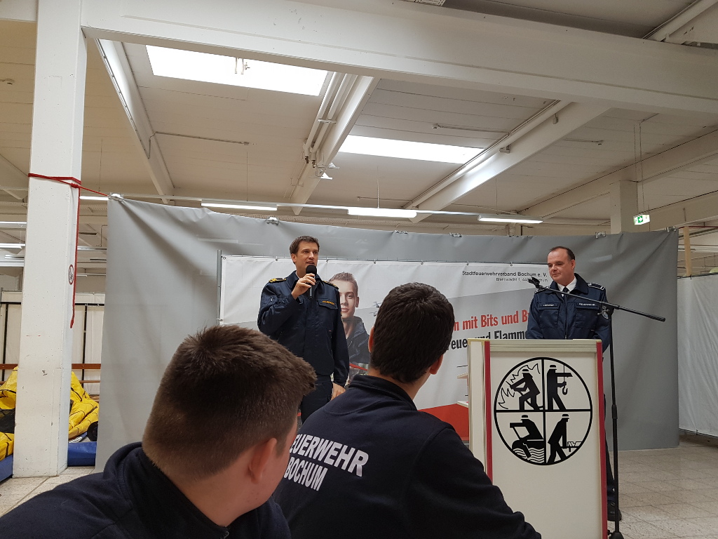 Auch der Amtsleiter der Feuerwehr Bochum Simon Heußen und diverse weiteren Kollegen aus der Branddirektion und aus anderen Löschzügen und Jugendgruppen ließen sich dieses aufregende Ereignis nicht entgehen.