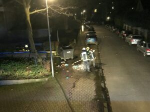 Am dritten Tag in Folge wurde die Löscheinheit Querenburg gegen 20:15 Uhr zu einem Einsatz alarmiert. Nun sollten laut Anrufer mehrere Papiercontainer brennen, weshalb zusätzlich ein Löschfahrzeug der Berufsfeuerwehr mitalarmiert wurde. Dieses konnte jedoch die Einsatzfahrt abbrechen, da bei unserem Eintreffen vor Ort lediglich eine Papiermülltonne brannte. Sie wurde mit dem Schnellangriff des LF 10 abgelöscht, die angrenzenden Mülltonnen wurden vorsorglich mit Wasser benetzt, um einer möglichen Brandstiftung vorzubeugen.