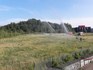 Um sich intensiv mit dem neuen LF20 KATS vertraut zu machen, wurde ein Flächenbrand auf einem großen Feld angenommen. Mehrere Strahlrohre und Wasserwerfer wurden zur Brandbekämpfung vorgenommen. Hierbei wurde auch gleich die Pumpe des Fahrzeugs auf die Probe gestellt und getestet, wie viel Wasser sie pro Minute maximal fördern kann.