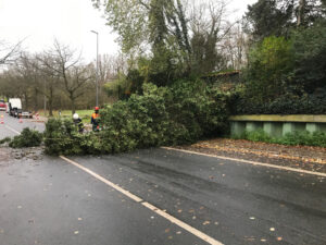 Um 10:27 Uhr wurde die Löscheinheint in die Schattbachstraße alarmiert. Dort sollte ein Baum aus einer Böschung auf die Straße gefallen sein und eine Fahrspur blockieren.