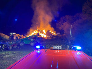 Vor Ort brannten ca. 200 aufgeschichtete Rundballen in voller Ausdehnung. Die Besatzungen des LF20 KatS und des LF10 legten unmittelbar die Wasserversorgung über eine lange Wegstrecke zur Einsatzstelle. Im Anschluss wurden die Kräfte der Berufsfeuerwehr zügig gegen ehrenamtliche Kräfte ausgetauscht, damit der Grundschutz im Wachgebiet wieder sichergestellt werden konnte.