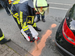 Um 20:46 Uhr wurden wir zur Brenschederstraße gerufen. Ein geparktes Auto verlor Benzin. Als wir eintrafen, trat kein Benzin mehr aus, sodass wir die bereits ausgetreten Mengen Benzin mit Bindemittel abstreuten und den Brandschutz sicherstellten. Das Fahrzeug wurde an einen Abschleppwagen übergeben.