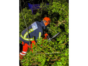 Bis in die späten Abendstunden (ca. 23 Uhr) fuhren wir insgesamt sieben versch. Einsatzstellen an. Nicht immer konnten wir eine Feststellung machen, da teilweise Bürger beherzt zugegriffen haben, wenn beispielsweise nur kleine Äste den Weg versperrten. In den meisten Fällen jedoch mussten wir unter Einsatz einer oder mehrerer Kettensägen die umgestürzten Bäume zersägen, zur Seite räumen und die Fahrbahn reinigen.